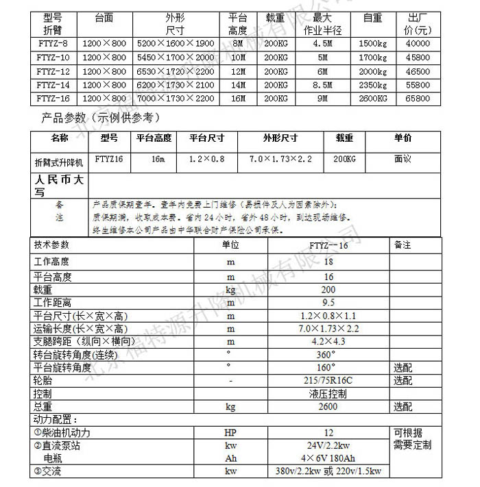 ▍牽引式折臂升降機(jī)常規(guī)參數(shù) / Product Parameter