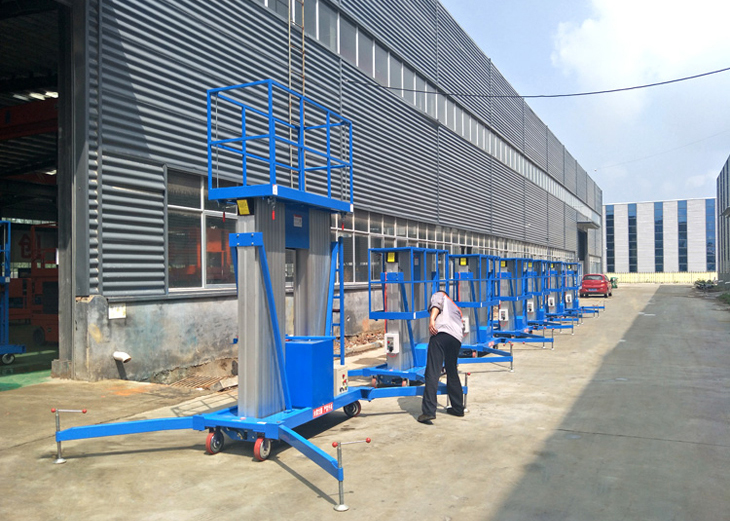 6、雙柱鋁合金升降機高度從8-12米不等,載重100-300KG,適合單人或者雙人高空作業(yè),自身只有幾百KG單人移動很方便。