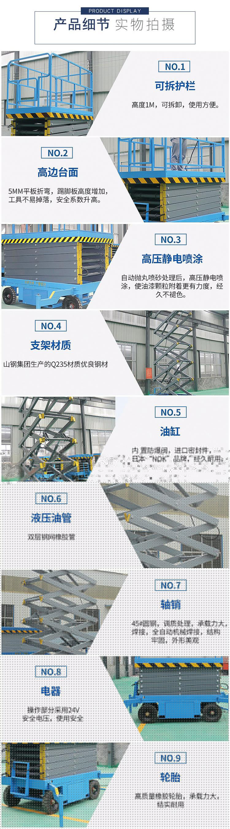 移動剪叉式升降機(jī)根據(jù)需求可選為二相、三相、電瓶、柴油機(jī)為升降動力,特殊場所也可選用防爆電機(jī),電器等。該升降機(jī)控制方式為電動上、下控制升降,手、電兩用或遙控器控制,在停電時仍可使用。該系列升降機(jī)具有移動靈活,升降平穩(wěn),載重量大,操作方便等特點(diǎn),移動升降機(jī)廣泛用于工廠、糧庫、機(jī)場、加油站、機(jī)關(guān)、碼頭、野外電力、路燈維護(hù)及建筑裝修等各種行業(yè)。移動升降機(jī)可根據(jù)用戶使用要求設(shè)計(jì)制造。