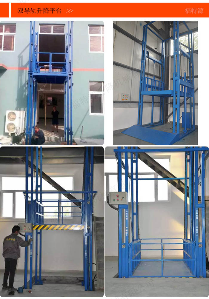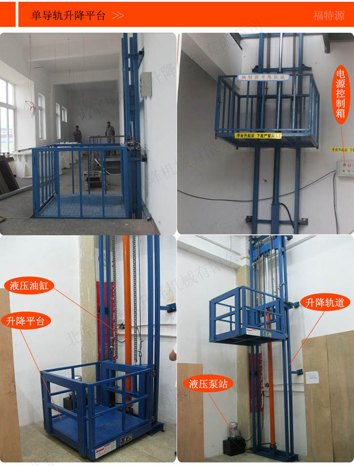 導軌式液壓升降貨梯是用于貨物升降的液壓升降機械設備,采用液壓油缸作為主要動力,通過重型鏈條和鋼絲繩傳動,保證機器運行的安全。無需地坑和機房,特別適合于有地下室、倉庫改造、新建貨架等,具有安裝維修方便、美觀、安全、操作方便。